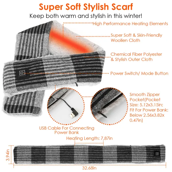 *USB Powered*:Powered by a portable mobile power source(Not Included) via a USB cable,just put it into the hidden zipped pocket inside the scarf then you can keep warm with this heated scarf anywhere anytime!